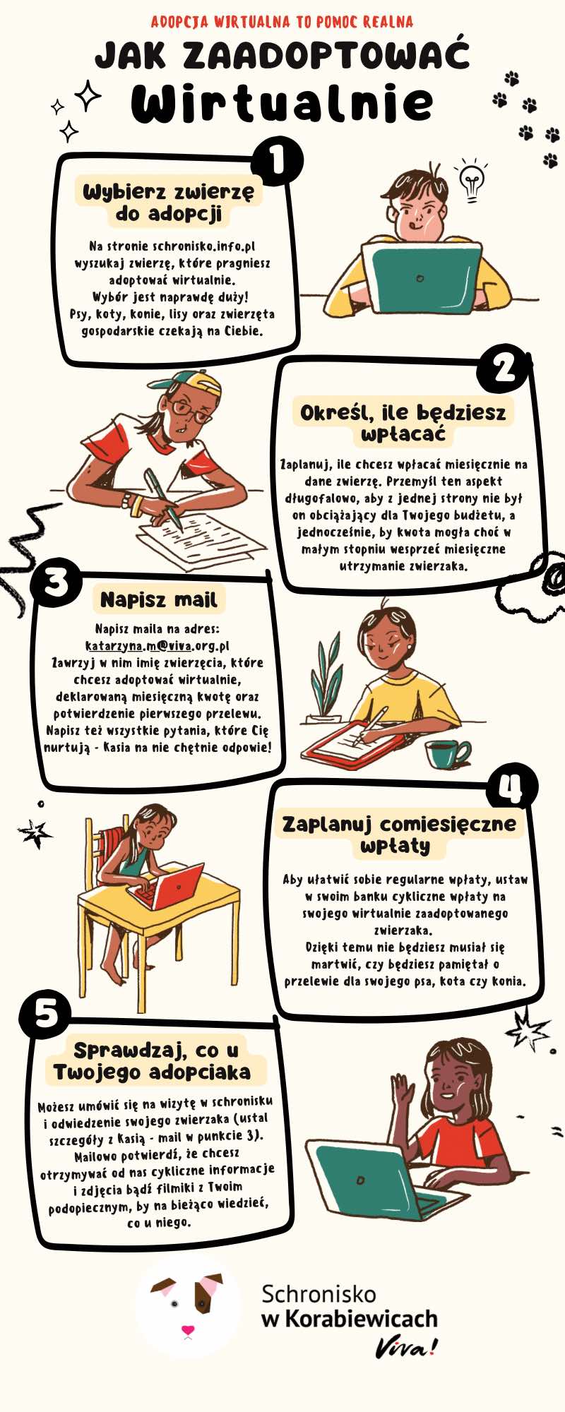 ● Napisz e-mail do koordynatora wirtualnych adopcji: katarzyna.m@viva.org.pl i zawrzyj w nim informacje: jakie zwierzę pragniesz zaadoptować wirtualnie, ile planujesz wpłacać miesięcznie na swojego podopiecznego oraz potwierdzenie pierwszej wpłaty. Z przyjemnością odpowiemy również na wszystkie pytania!