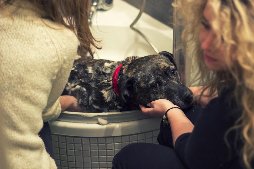 A później kolejny stres – kąpiel poschroniskowa. Ale Gosia nam pomogła i Maniuś szybko i sprawnie został wykąpany.
