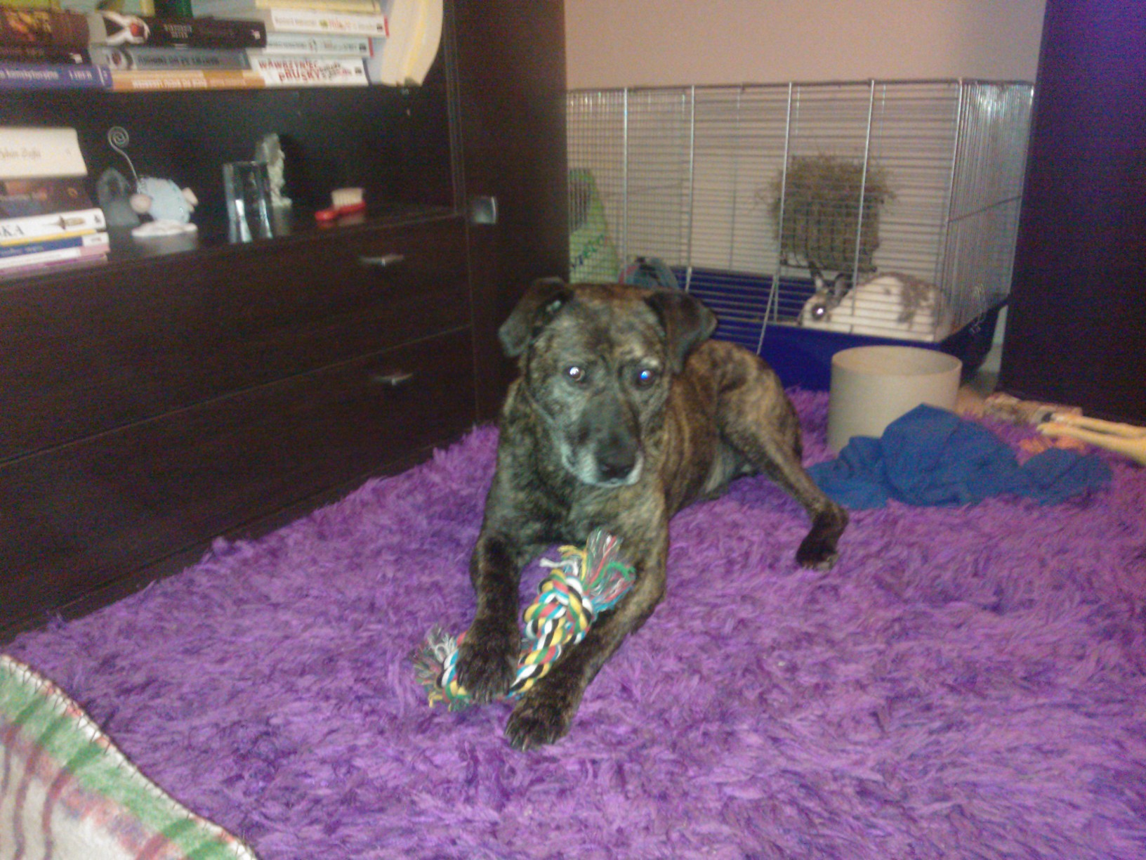 Przez dwa pierwsze dni przez stres oraz zmianę miejsca pobytu (wcześniej buda i dwór, teraz ciepłe mieszkanko) Maniuś bardzo ziajał, ale powoli się uspokajał i zaczął normalnie oddychać.