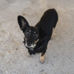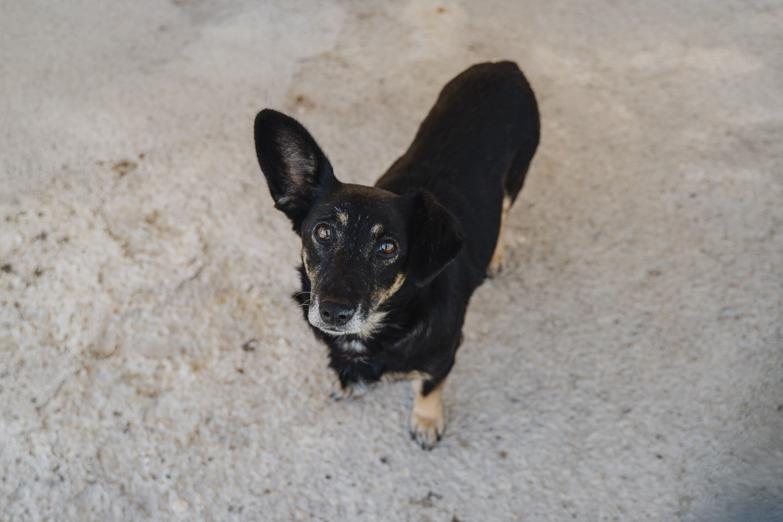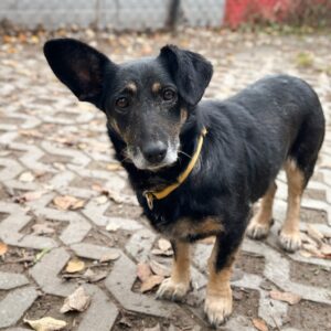 Dymka to starsza, delikatna sunia. Jest trochę niepewna, ale nie boi się człowieka. Jest ciekawa, podchodzi po smaczki i z bliska obserwuje. Z każdym dniem nabiera zaufania.