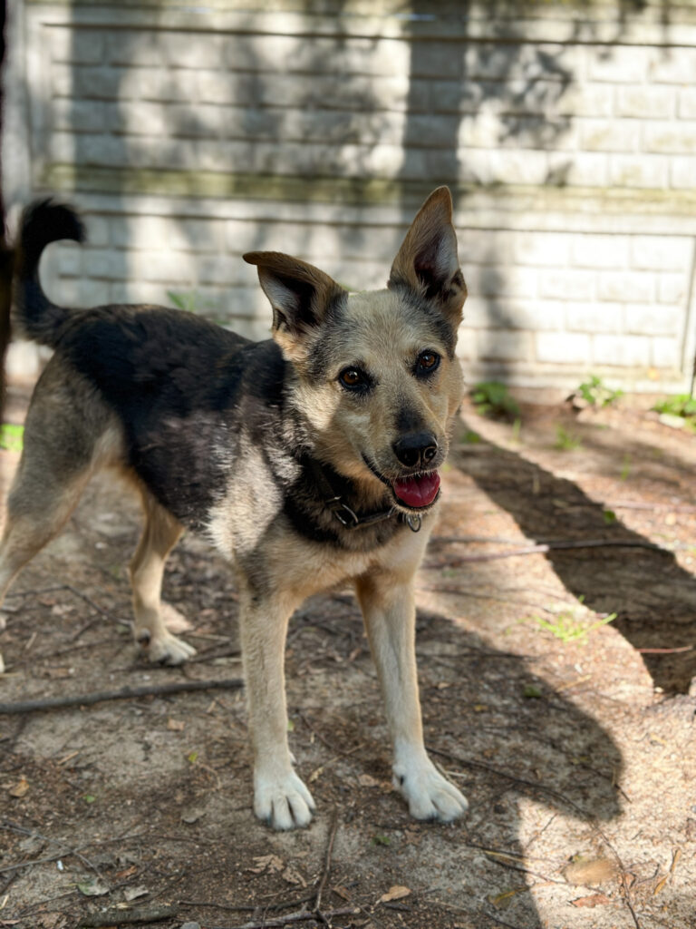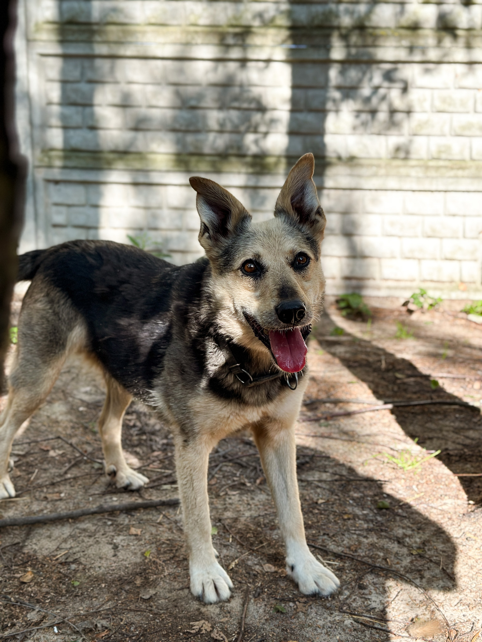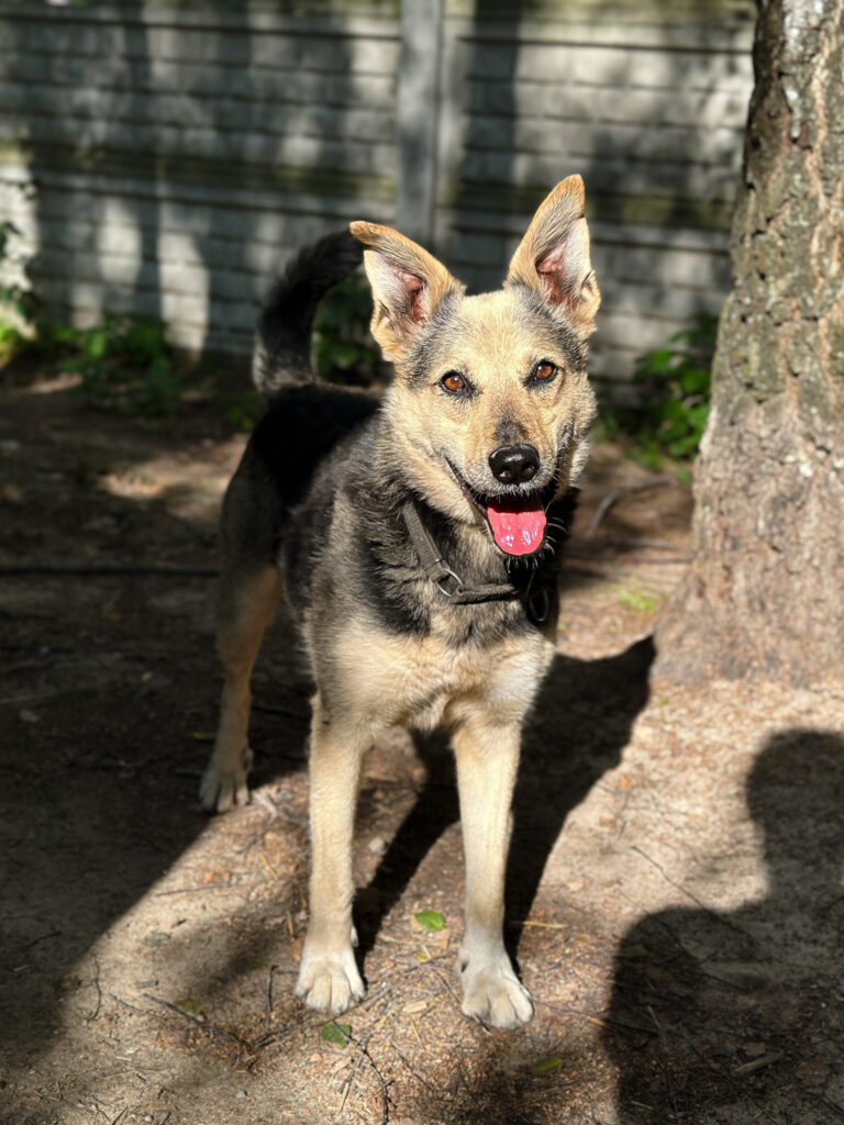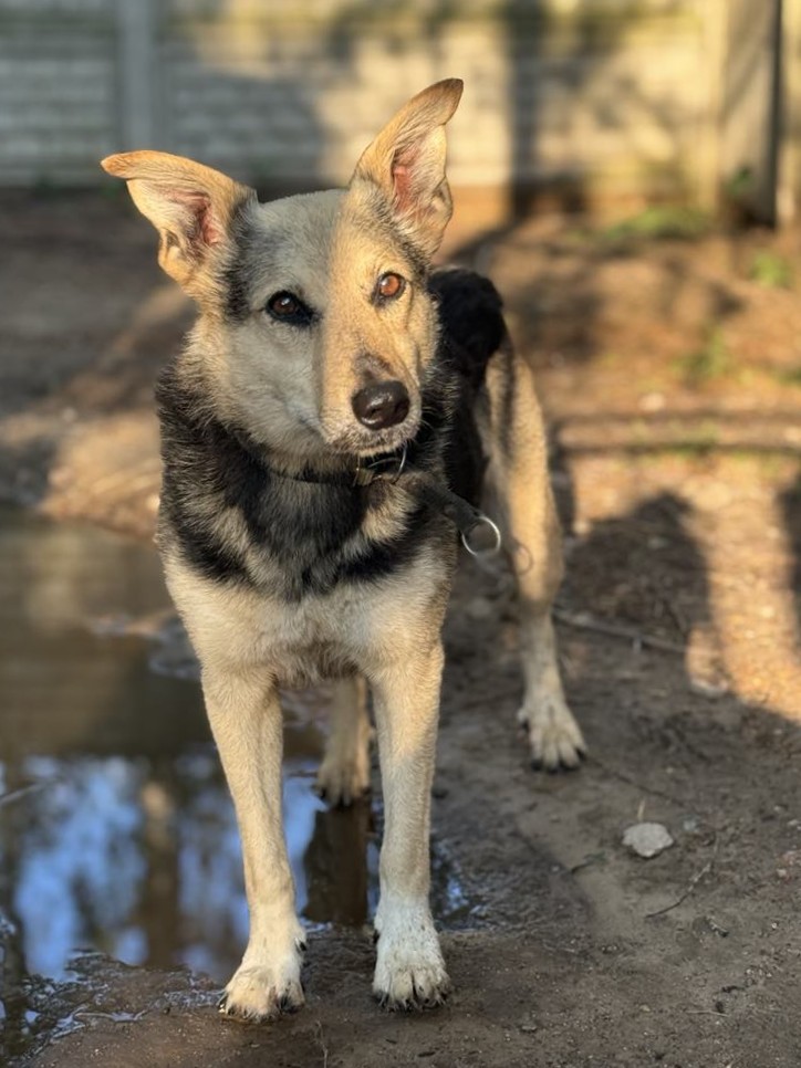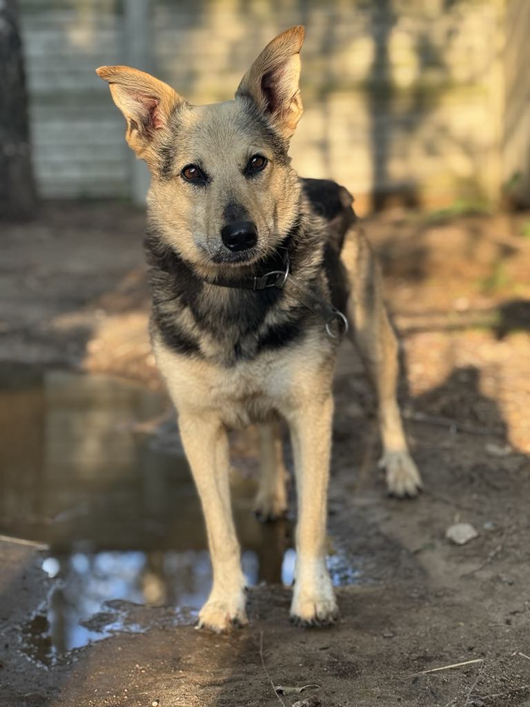 Ella jest uroczą średniej wielkości, delikatną i wrażliwą sunią. Grzeczna, nieśmiała, troszkę wycofana, ale pięknie chodzi na lince, podąża za opiekunem, nie ciągnie. Boi się innych psów ale nie panikuje, raczej wycofuje się, dając opiekunowi sygnał, że nie chce kontaktu.