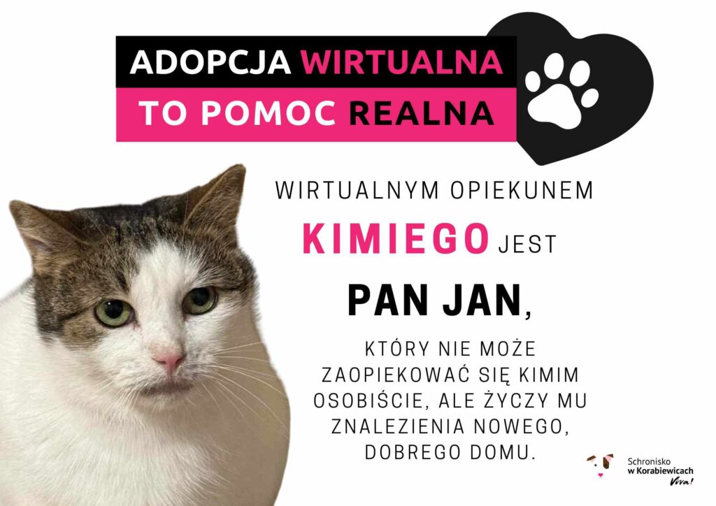 Kimi to kocur urodzony około 2021r. Jest raczej spokojny i wycofany, bardzo boi się człowieka – ucieka na sam widok. Nie jest agresywny. Korzysta z kuwety. Testy FIV/FeLV ujemne.