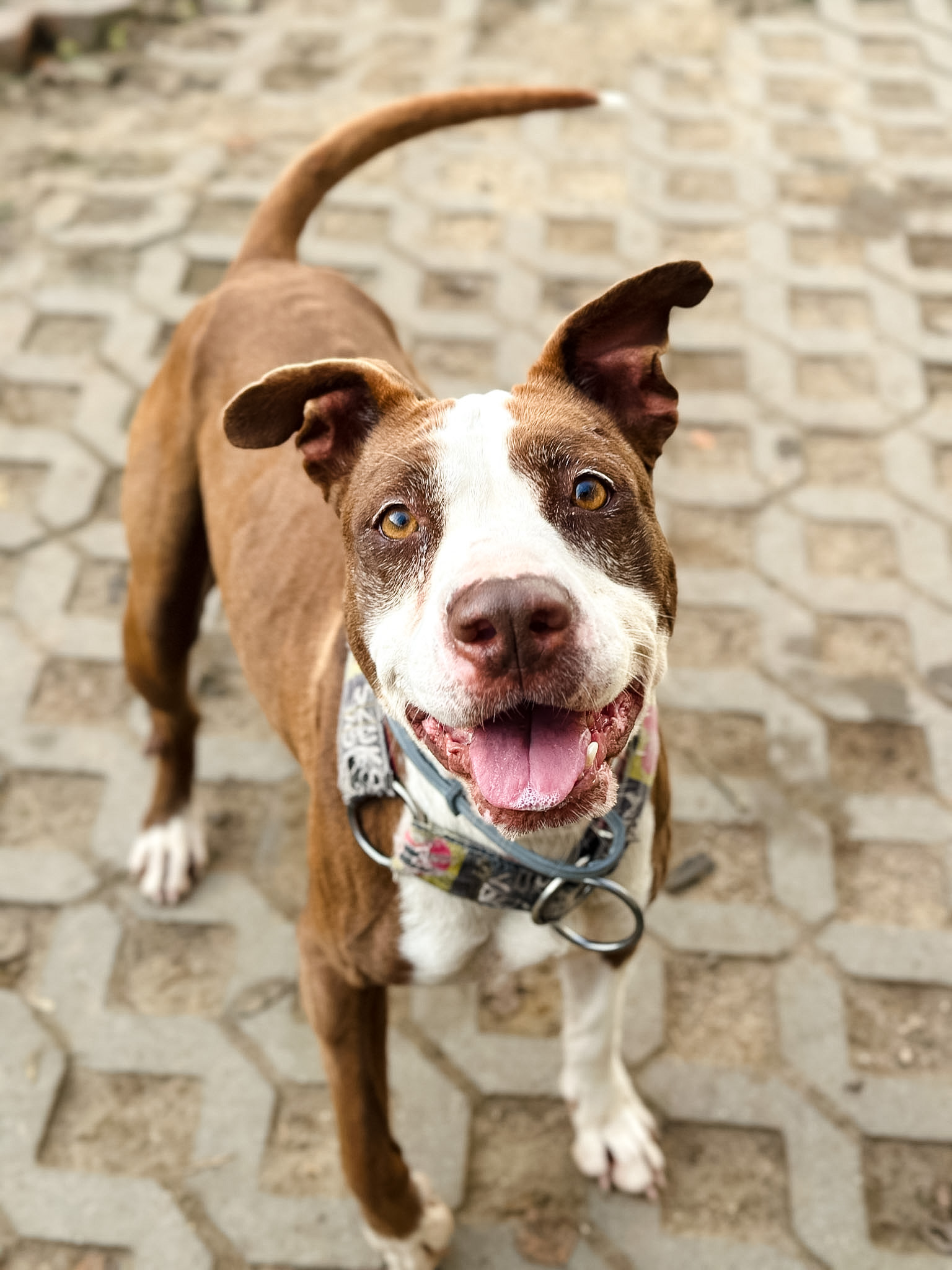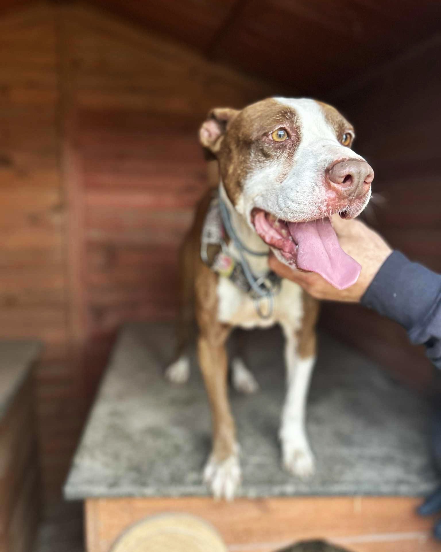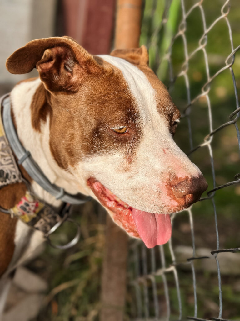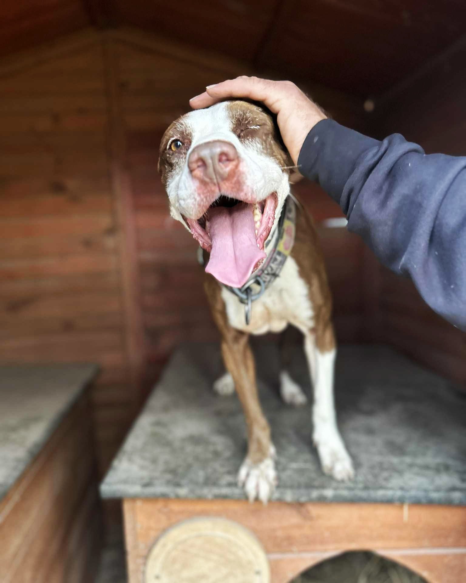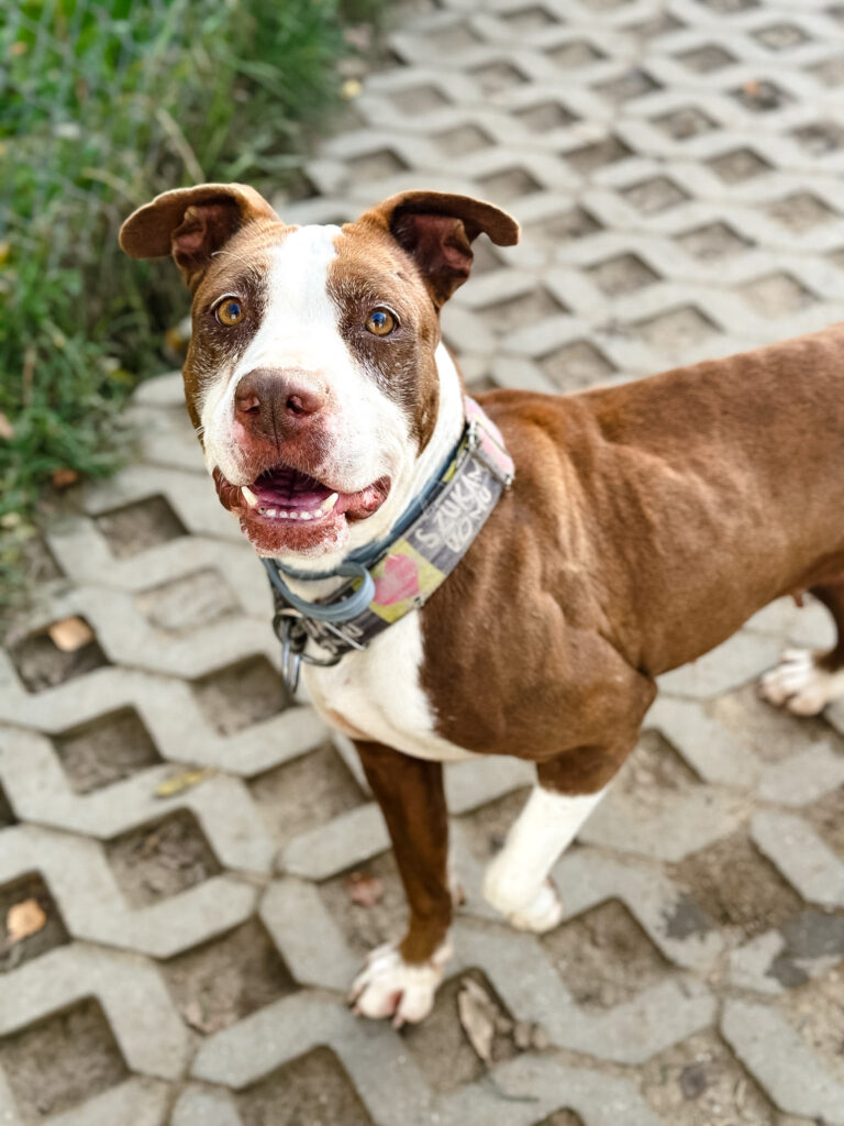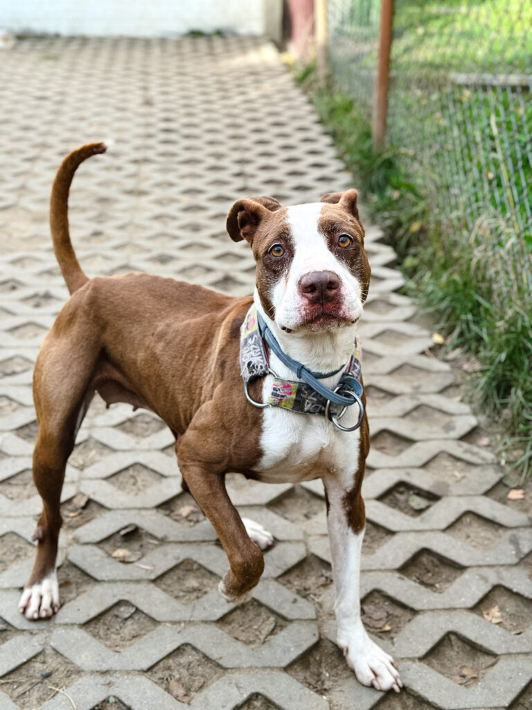 Milka to dojrzała suczka w typie AST. Jej była właścicielka przyszła do lecznicy, aby… ją uśpić! W toku wizyty okazał się, że Milka była głodzona. Miała też rany, szramy i zmiany na ciele… Patrząc na nią nie da się nie zauważyć, że wiele przeszła w życiu. Trzymana była w komórce, nie dostawała odpowiednich ilości pokarmu i wody.