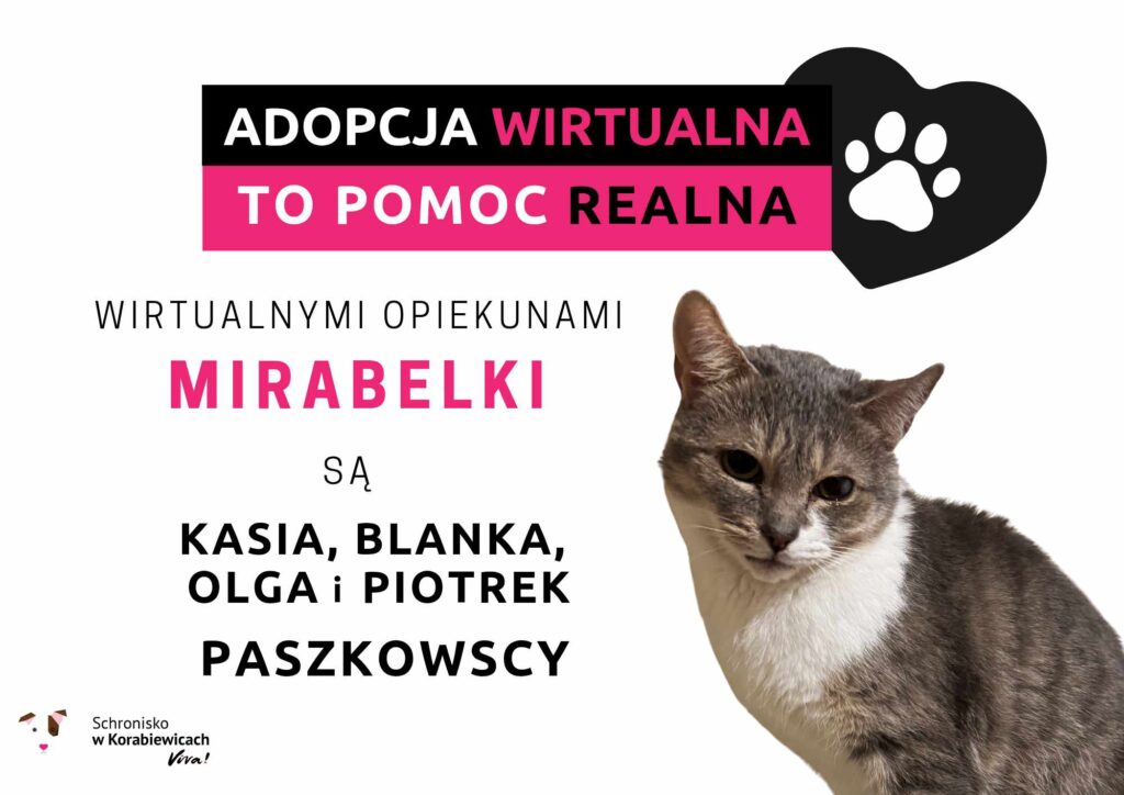 Mirabelka to kotka, która wraz z 13-stką innych kotów przyjechała do nas z opuszczonego mieszkania, po eksmisji lokatorki… Mieszkanie jest w tragicznym stanie, wszędzie odchody, śmieci i straszny smród… Mirabelka to raczej starsza kotka, urodzona około 2016r. Nie ma zębów oraz posiada bliznę na oku. Jest spokojna i nieśmiała, jeszcze boi się człowieka. Nie jest agresywna. Korzysta z kuwety. Testy FIV/FeLV ujemne.